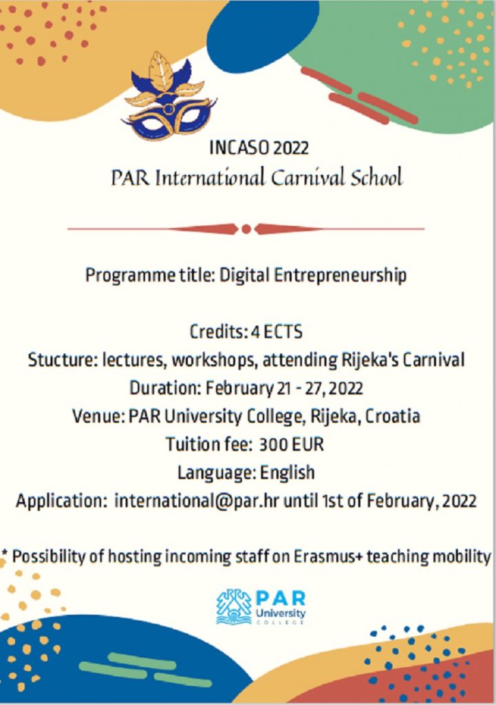 Chorwacki PAR University College zaprasza do udziału w tradycyjnej Międzynarodowej Szkole Karnawałowej (INCASO), która odbędzie się w dniach 21-27 lutego 2022 r. w Rijece w Chorwacji. Tegoroczny temat INCASO to Przedsiębiorczość Cyfrowa. Studenci mają okazję wziąć udział w wykładach wybitnych międzynarodowych naukowców i praktyków, poznać ciekawostki o chorwackiej kulturze i języku oraz wziąć udział w wyjątkowm karnawale w Rijece.