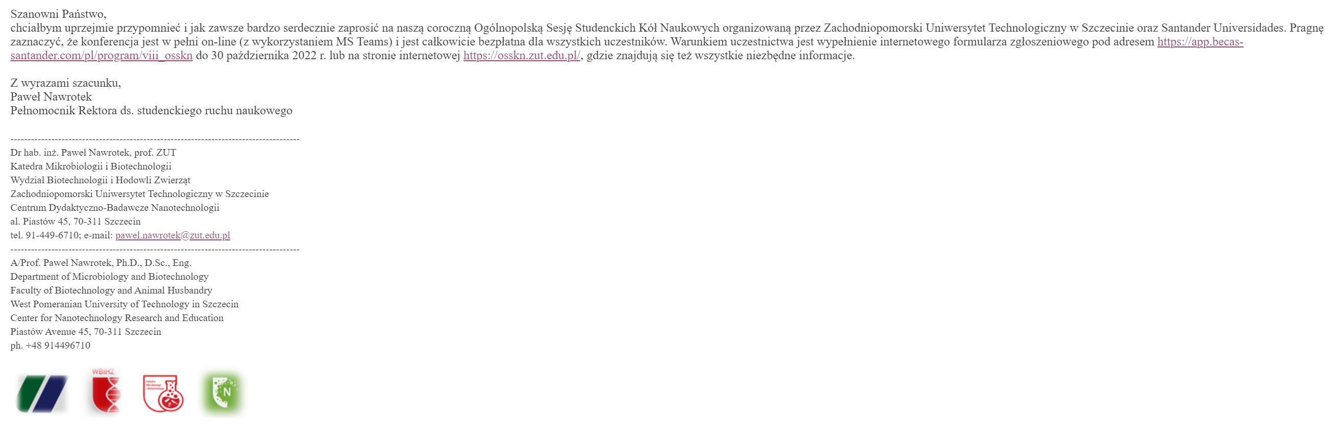 Pragnę zaznaczyć, że konferencja jest w pełni on-line (z wykorzystaniem MS Teams) i jest całkowicie bezpłatna dla wszystkich uczestników. Warunkiem uczestnictwa jest wypełnienie internetowego formularza zgłoszeniowego pod adresem https://app.becas-santander.com/pl/program/viii_osskn do 30 października 2022 r. lub na stronie internetowej https://osskn.zut.edu.pl/, gdzie znajdują się też wszystkie niezbędne informacje.